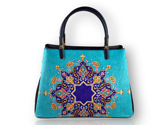 Bolso de cuero sintético azul oscuro con asas y un hermoso diseño con el delicado arte persa del "tazhib" o iluminación sobre fondo turquesa