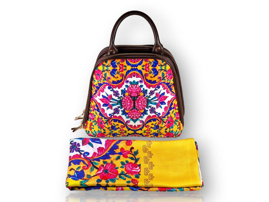Mochila de cuero sintético marrón con asa y pañuelo cuadrado a juego,ambos inspirados en los azulejos de la mezquita Nasir ol Molk de Shiraz