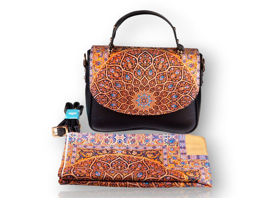 Bolso de cuero sintético negro y pañuelo cuadrado a juego, inspirados en el diseño de la cúpula de la mezquita Sheikh Lotfollah de Isfahán.