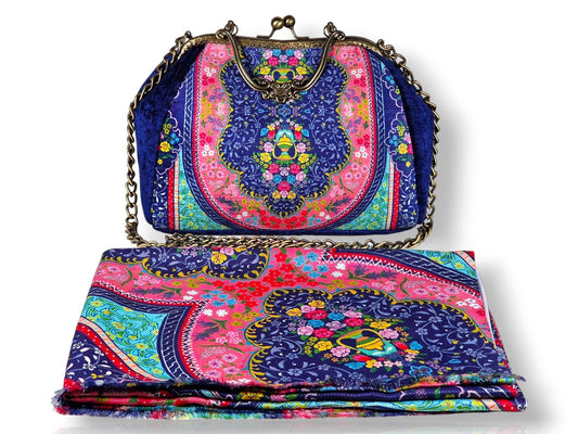 Bolso persa vintage con elegante asa y cadena de bronce y pañuelo rectangular a juego con un colorido diseño de floreros e "islimi".