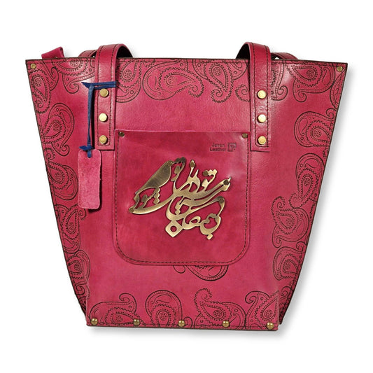 Bolso tote granate de cuero vacuno natural decorado con un hermoso poema de Rumi en caligrafía artística persa Nastaliq tallada en latón.