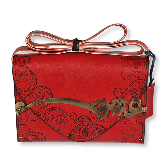 Bolso rojo de cuero vacuno natural y madera decorado con la palabra "AMOR" en caligrafía artística persa Nastaliq tallada en latón.