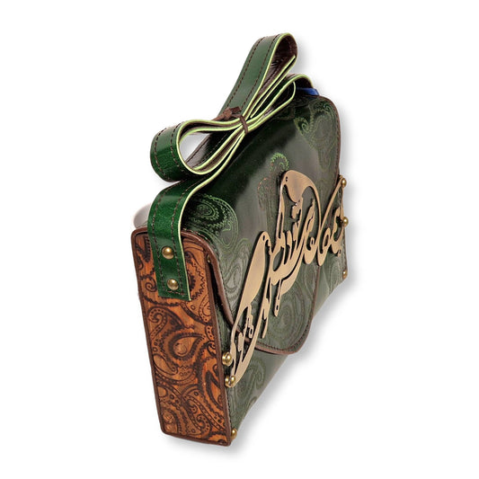 Bolso verde de cuero vacuno natural y madera decorado con un hermoso poema de Rumi en caligrafía artística persa Nastaliq tallado en latón.
