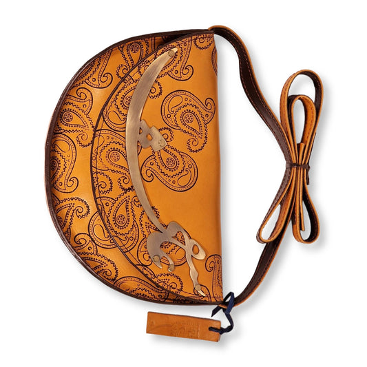 Bolso mostaza de cuero vacuno natural decorado con la palabra "ENAMORADO" en caligrafía artística persa Nastaliq tallada en latón.
