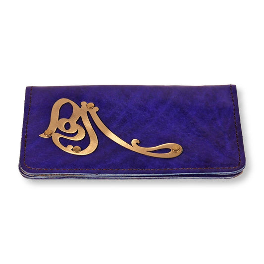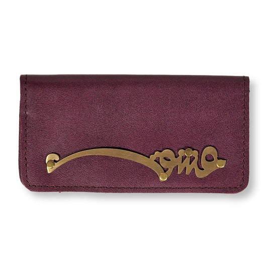 Cartera morada de cuero vacuno natural hecha a mano decorada con la palabra “AMOR” en caligrafía artística persa Nastaliq tallada en latón.