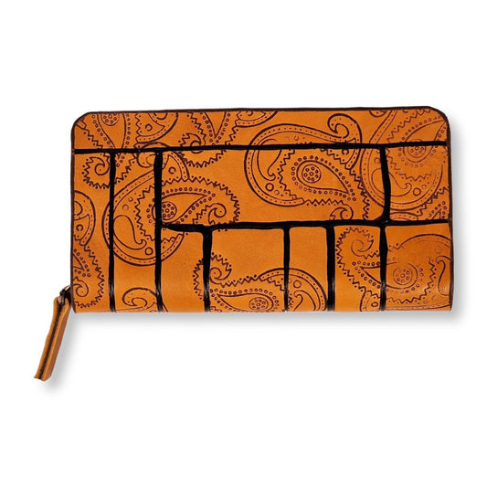 Cartera mostaza de cuero vacuno natural hecha a mano con dibujos de "boteh jeghe", un regalo original y exclusivo del arte persa.