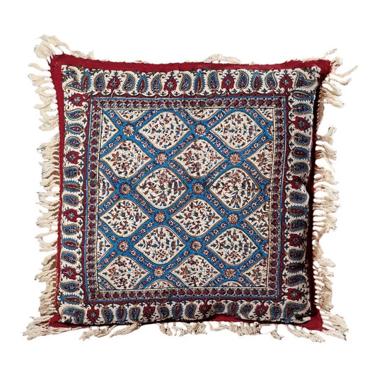 Funda de cojín estampada a mano empleando sellos de madera y pigmentos naturales,elaborada en algodón con la técnica persa del "Ghalam kari"