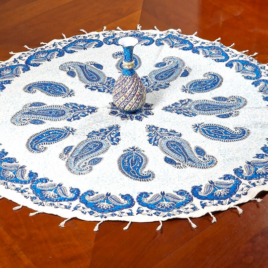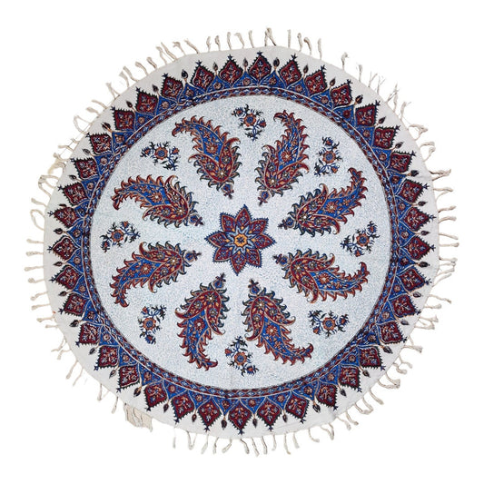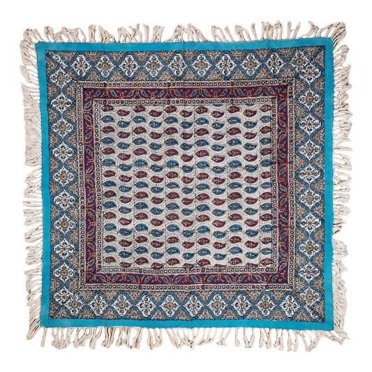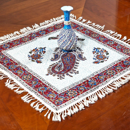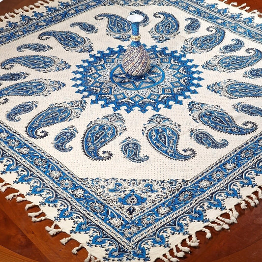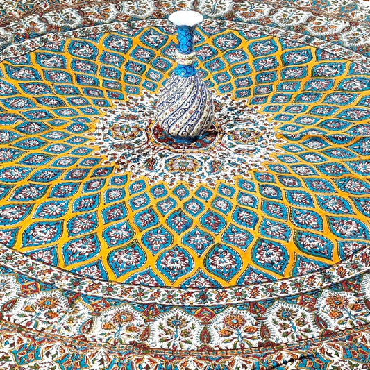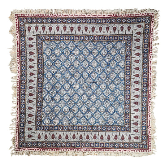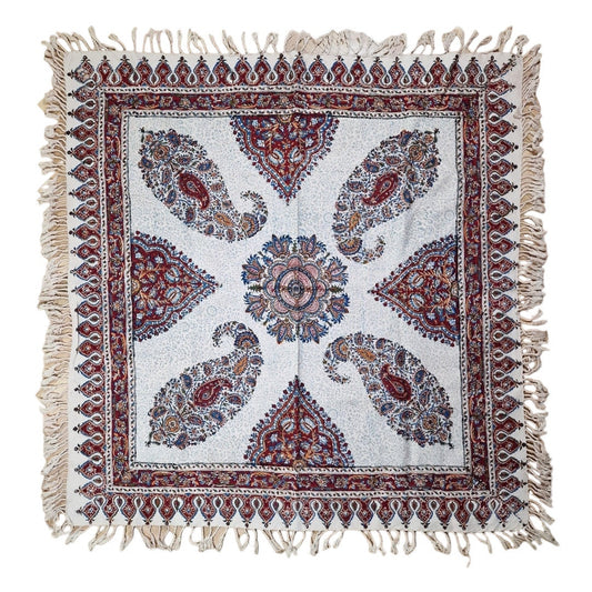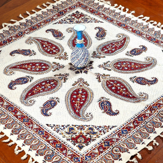 Mantel estampado a mano empleando sellos de madera y pigmentos naturales, elaborado en algodón con la técnica persa del "Ghalam kari".