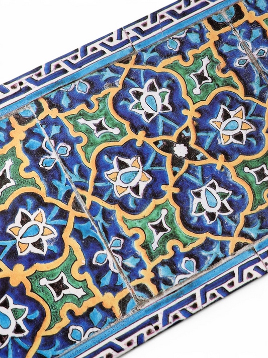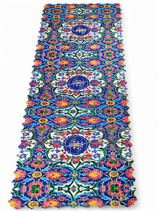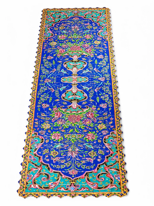 Camino de mesa inspirado en un panel de azulejos persas florales de época Qajar que decora el patio del Santuario del Imán Reza en Mashhad.
