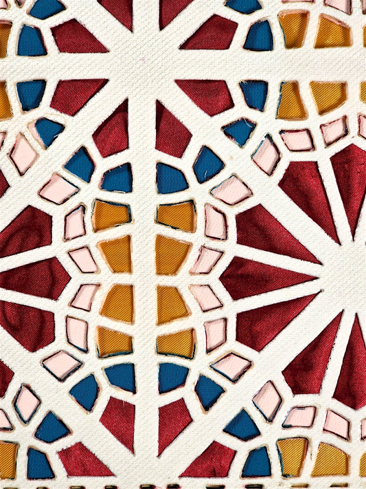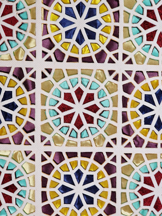 Mantel cuadrado artesanal elaborado por una joven artista de Kashmar (noreste de Irán), con un diseño inspirado en las ventanas orosí de las casas tradicionales persas.