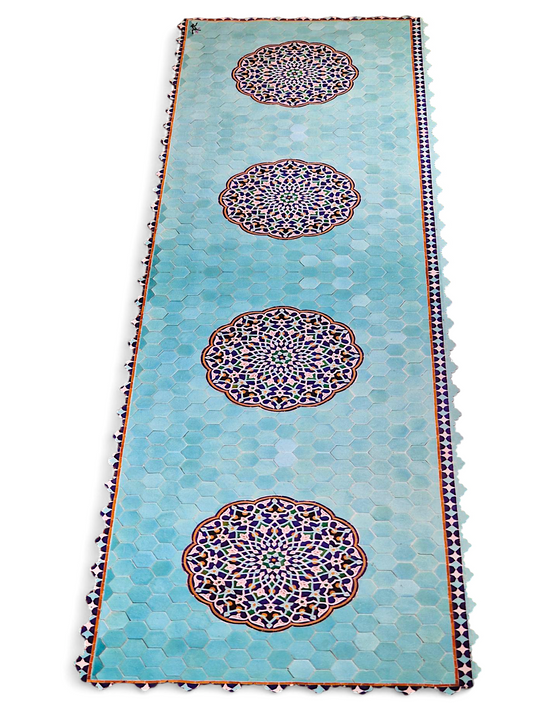 Camino de mesa inspirado en uno de los paneles de azulejos persas turquesas que decoran la Gran Mezquita de Yazd.