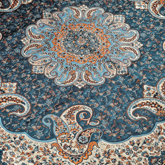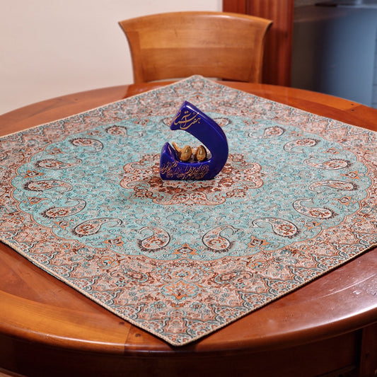 Lujoso mantel decorativo "termeh" con diseño Afshar sobre un fondo turquesa, un regalo exclusivo del arte persa para el Nowruz.