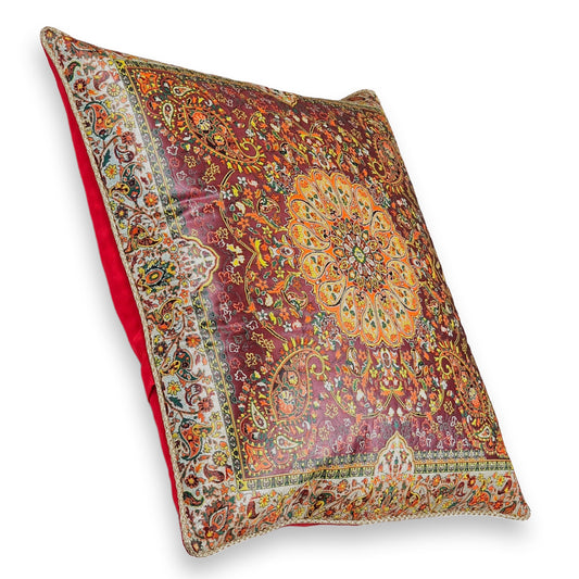 Lujosa funda de cojín de "termeh" con diseño Afshar sobre un fondo granate, un regalo exclusivo del arte persa.