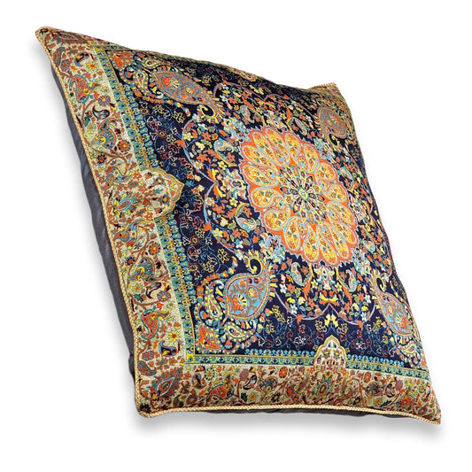 Lujosa funda de cojín de "termeh" con diseño Afshar sobre un fondo azul marino, un regalo exclusivo del arte persa.