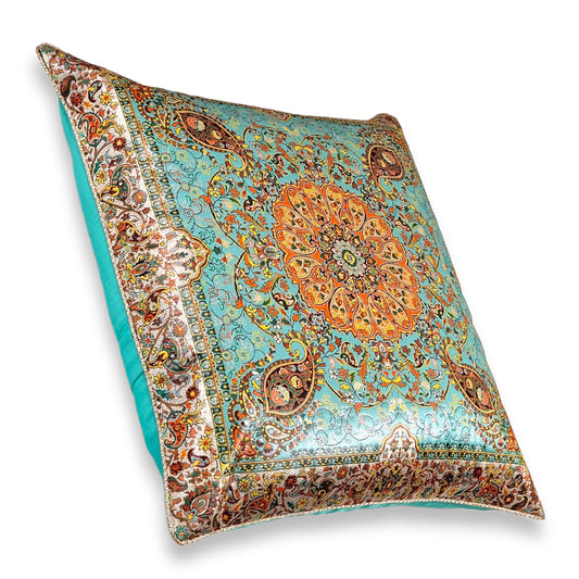 Lujosa funda de cojín de "termeh" con diseño Afshar sobre un fondo turquesa, un regalo exclusivo del arte persa para la Navidad