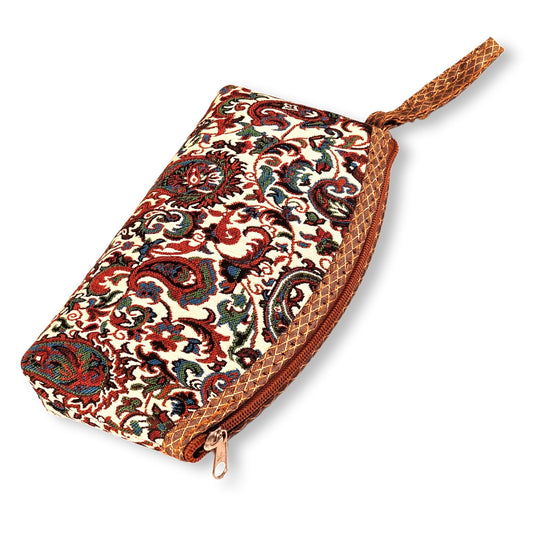 Hermoso y práctico neceser elaborado con tela de "termeh" con un hermoso diseño persa de "boteh jeghe" sobre fondo crema.
