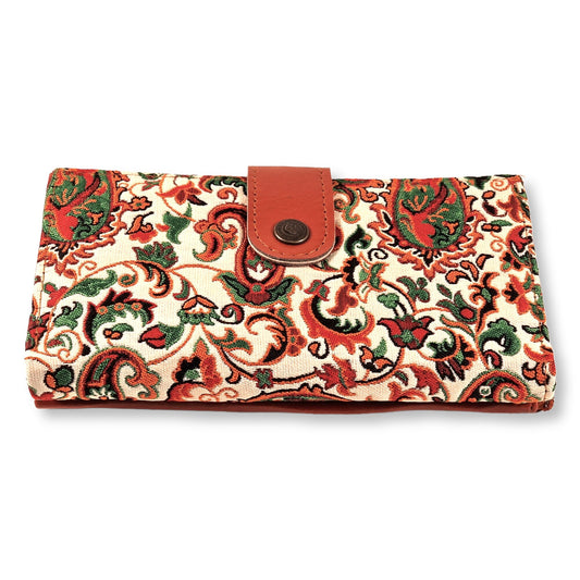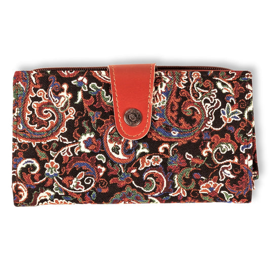Original cartera elaborada con tela de "termeh" con un hermoso diseño persa de "boteh jeghe" sobre fondo crema.