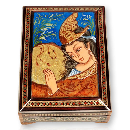 Rectangular wooden jewelry box with marquetry or "khatam kari" hand painted with the miniature of a woman playing a Persian lute