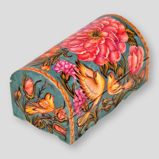 Hand-painted camel bone jewelry box with a miniature design using the Persian art of "tazhib" or gilded illumination.