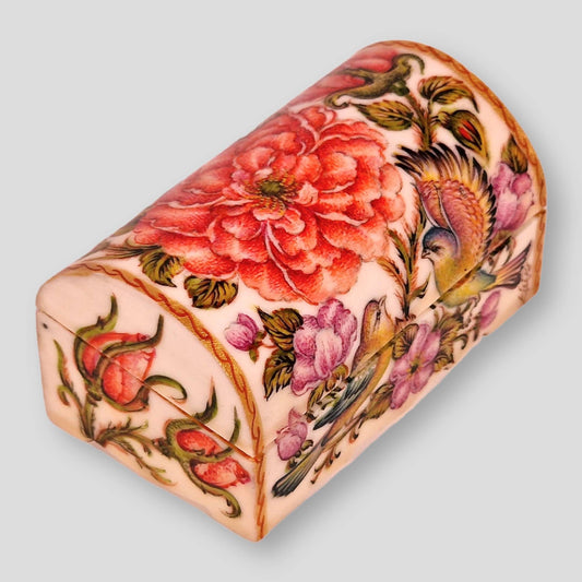 Hand painted camel bone jewelry box with a miniature design inspired by the Persian art of "Gol o Morgh" (the flower and the bird)