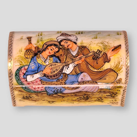 Hand-painted camel bone jewelry box with a Persian miniature design inspired by the love story of "Leyli and Majnun."
